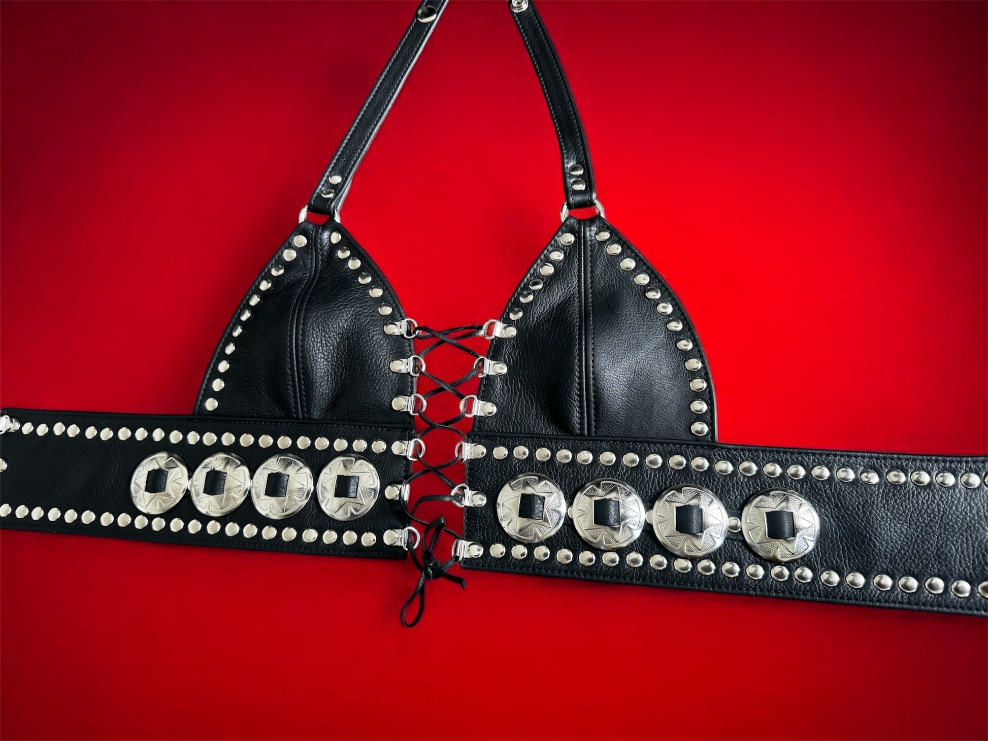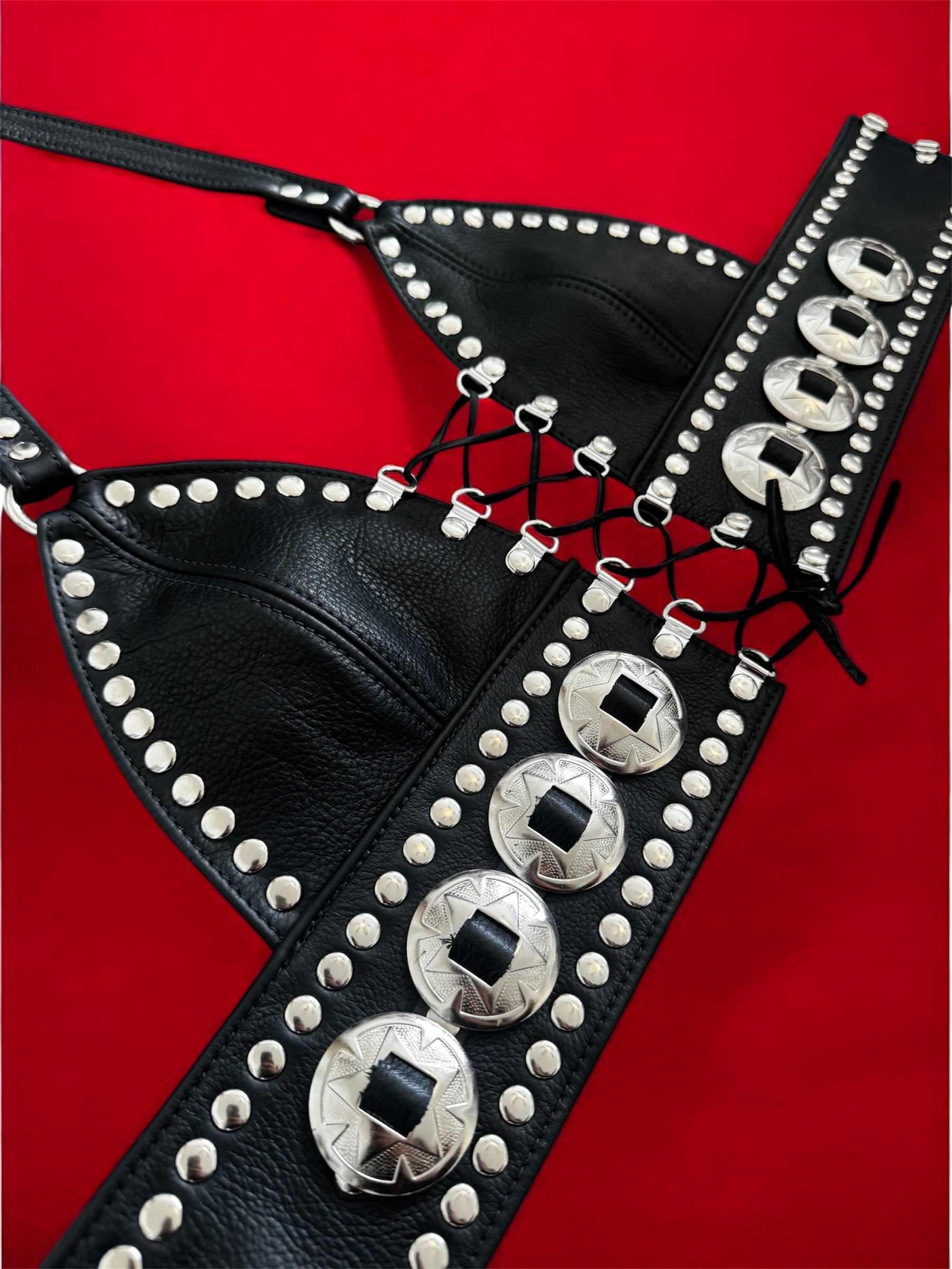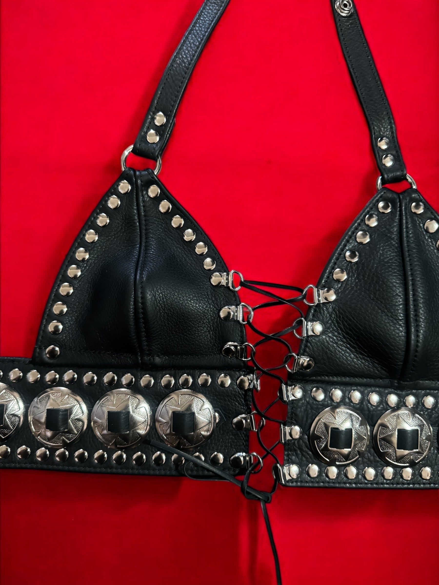 This handcrafted garment is made from high-quality full-grain cowhide leather. The top is both sturdy and supportive. It features adjustable neck straps with snap rivets, while the middle front back back laces create a lifted effect.
