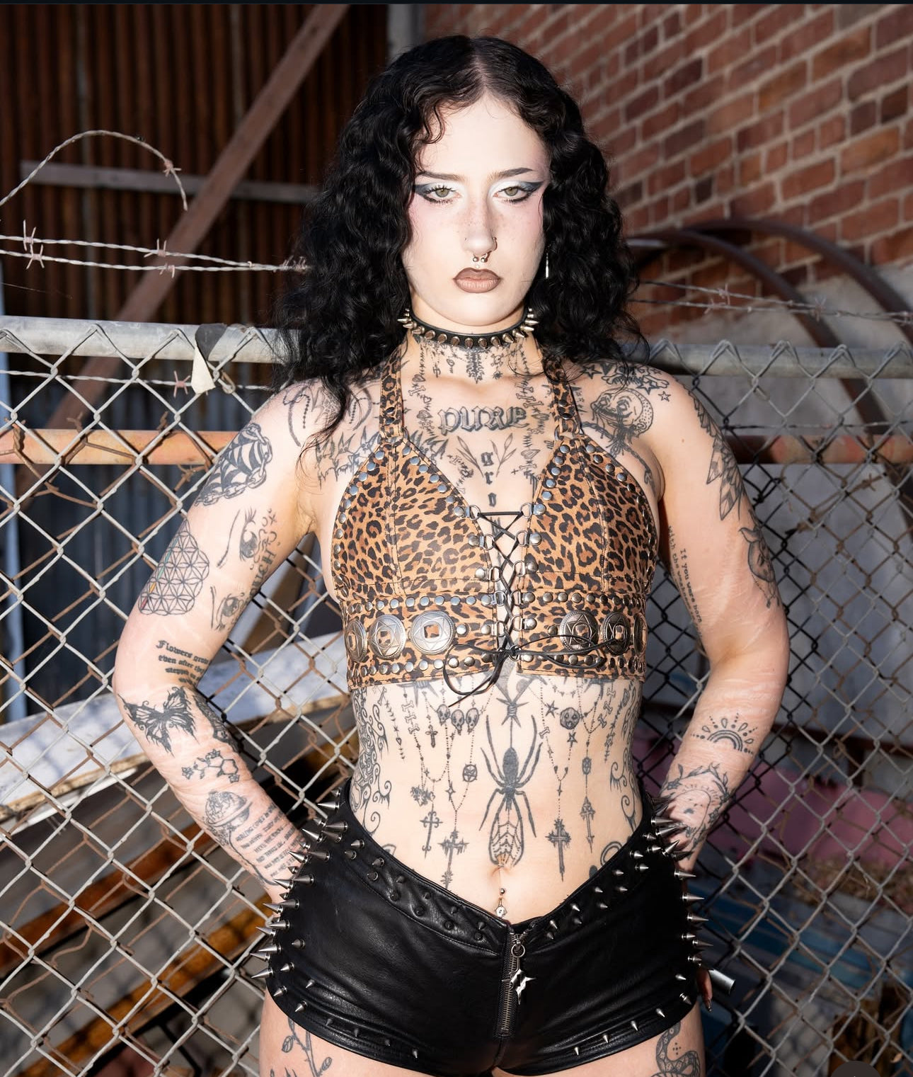 A bold statement piece crafted for impact. This handmade leather bralette features a striking leopard print finish with structured triangle cups for a flattering, secure fit. Silver-tone rivets frame the design, adding industrial edge, while the adjustable lace-up front allows for customizable shaping and attitude.