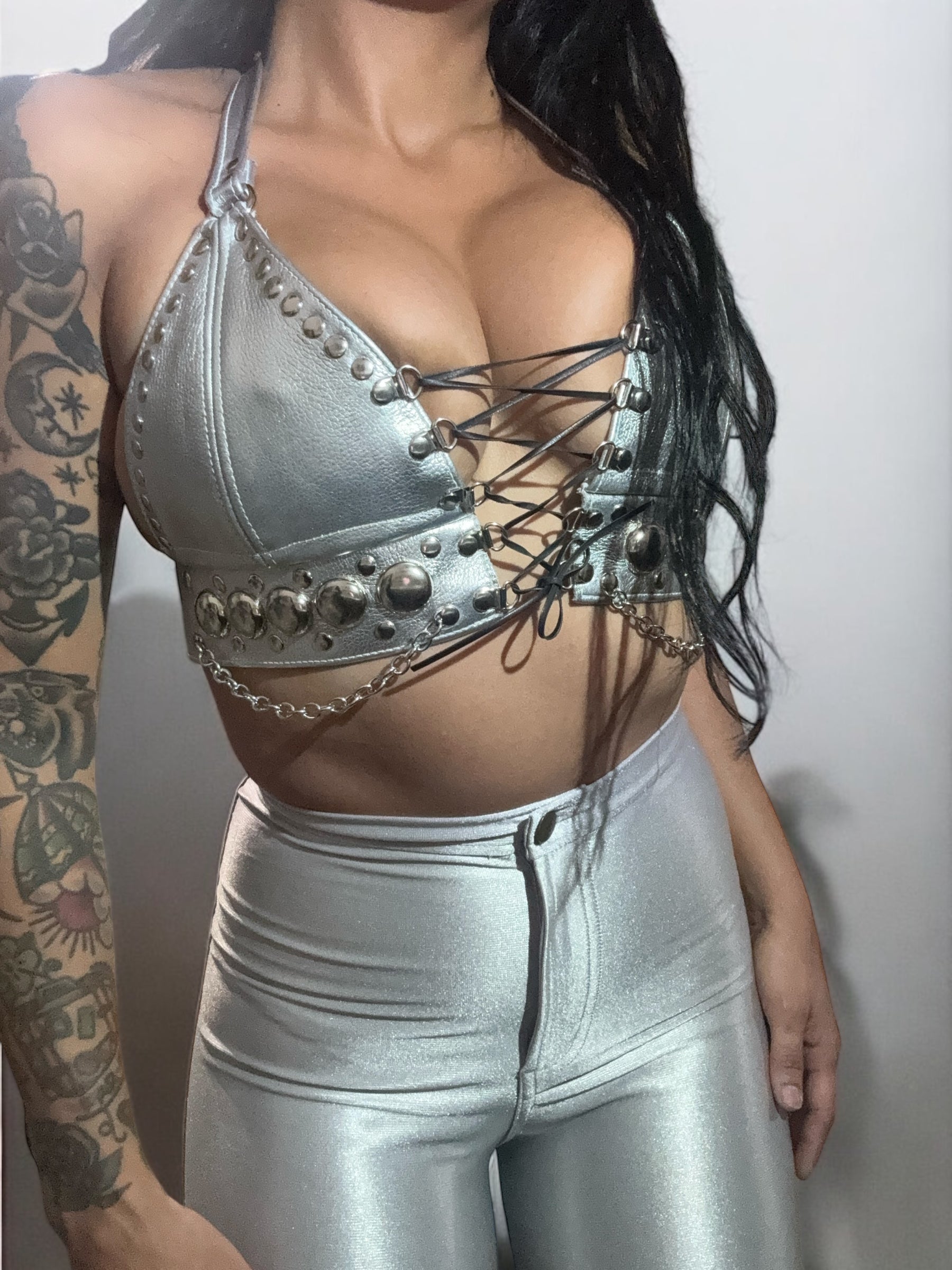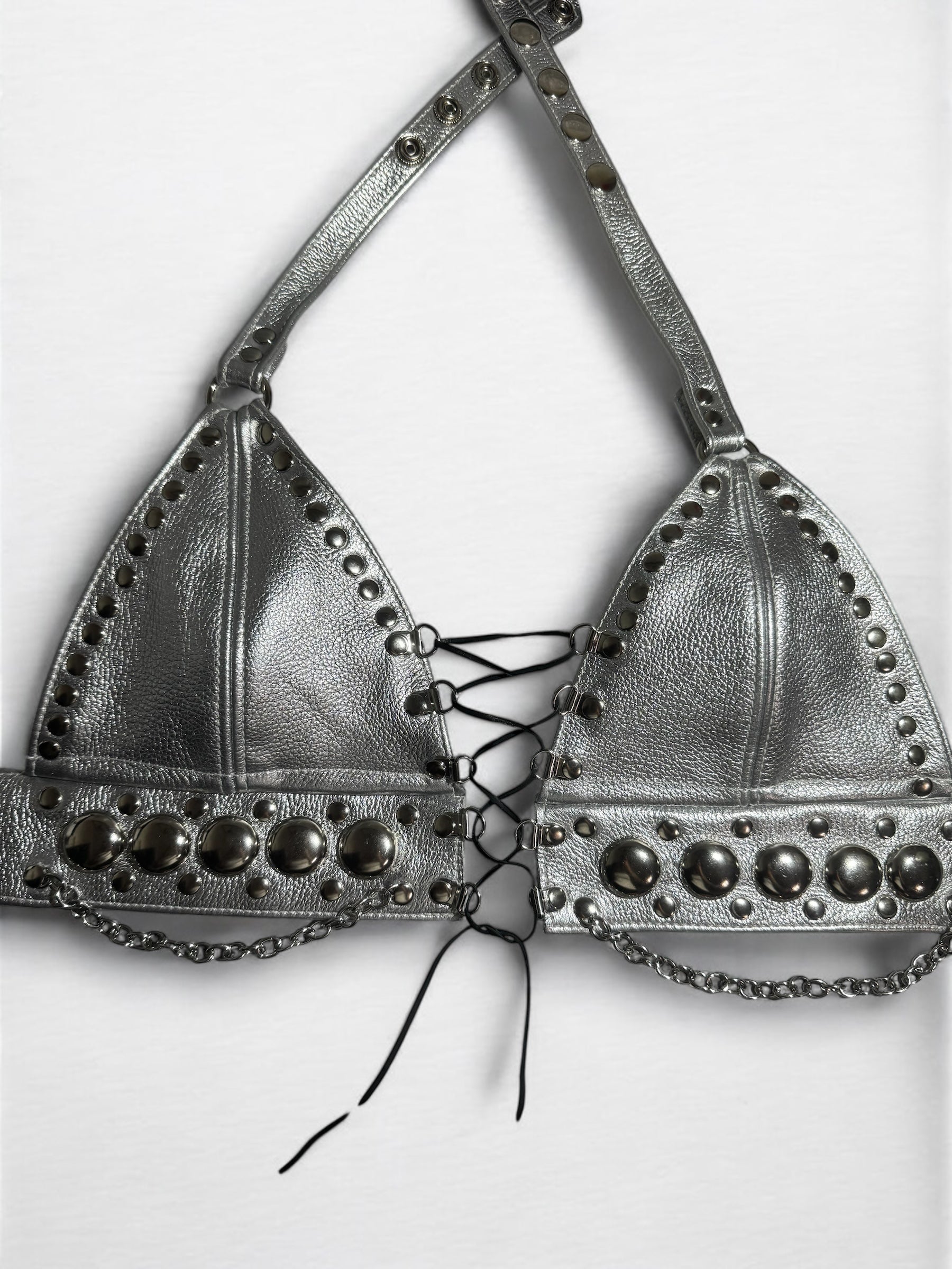 Indulge in the elegance of silver! This exquisite piece is meticulously crafted from premium full-grain cowhide leather, adorned with durable stainless steel chains, and enriched with striking silver rivets and studs.