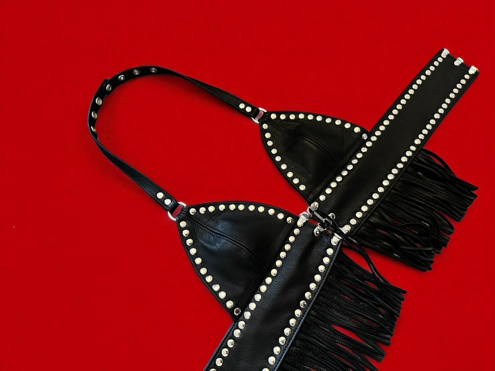 Turn heads with this bold, handcrafted halter top made from premium black leather. Designed with a daring silhouette, it features silver-tone stud accents along the edges for a rebellious, rock-inspired touch. The wide leather band is adorned with dramatic fringe that moves with you, adding both texture and attitude. Adjustable leather straps ensure a secure fit, making it perfect for concerts, festivals, or statement streetwear looks.